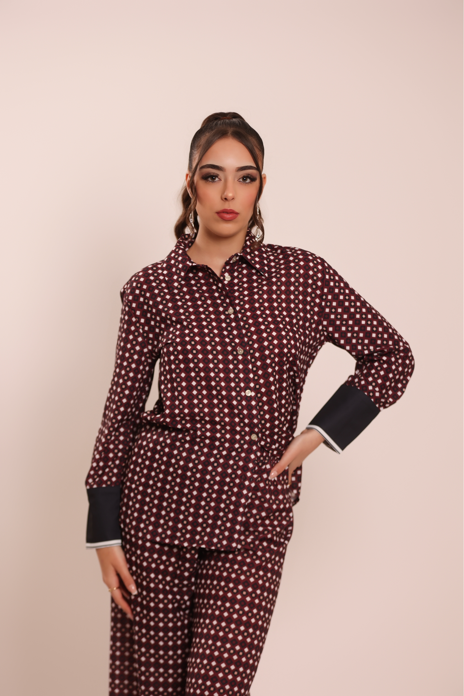 Zweiteiliges Set in Burgunderrot mit geometrischem Aufdruck. Aus hochwertigem Satinstoff gefertigte, langärmelige Jacke mit Hemdkragen und Knopfverschluss. Kontrastierende Bündchen für einen raffinierten Touch. Hose mit weitem Bein und elastischem Bund für eine bequeme und schmeichelhafte Passform.