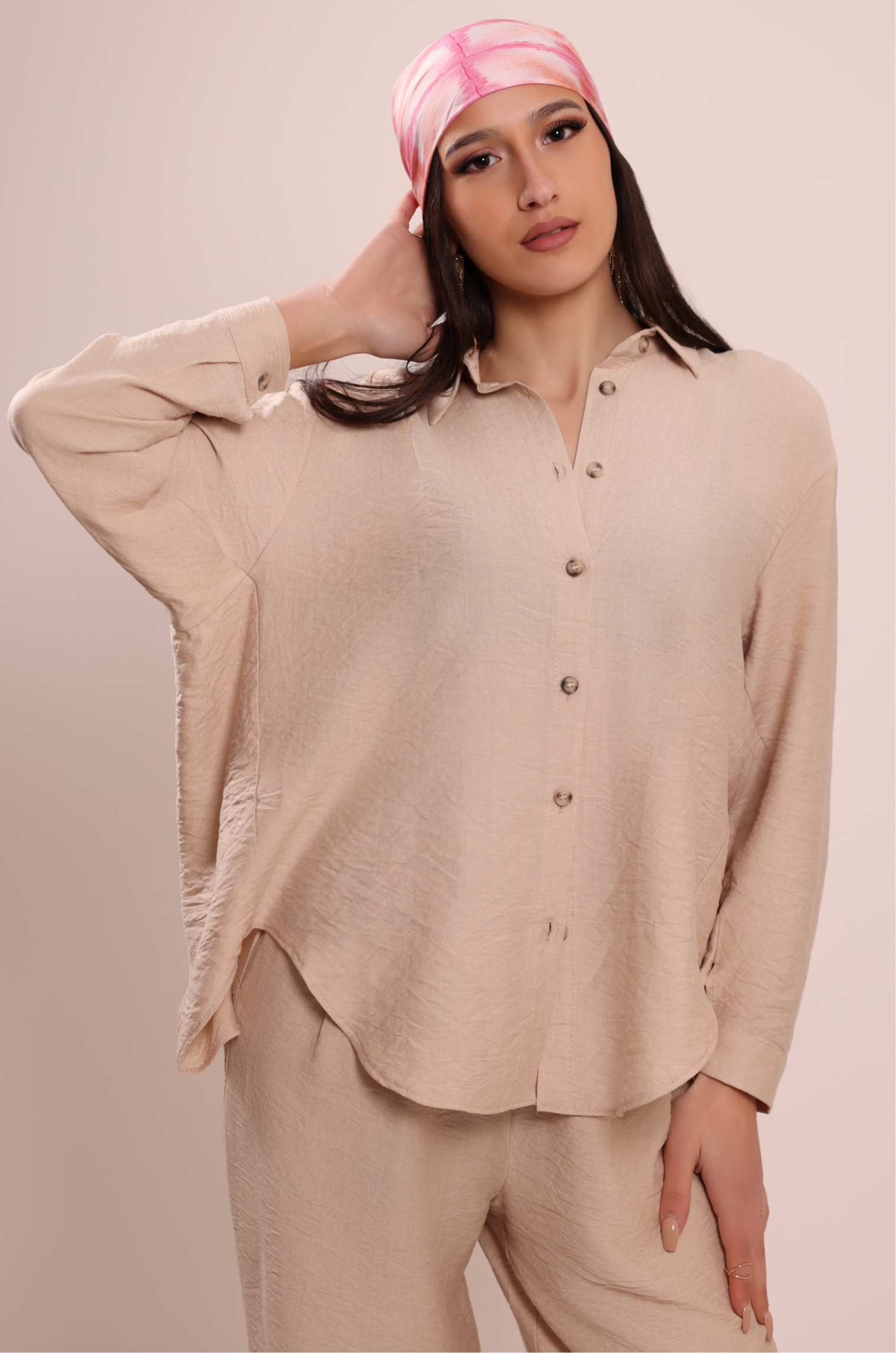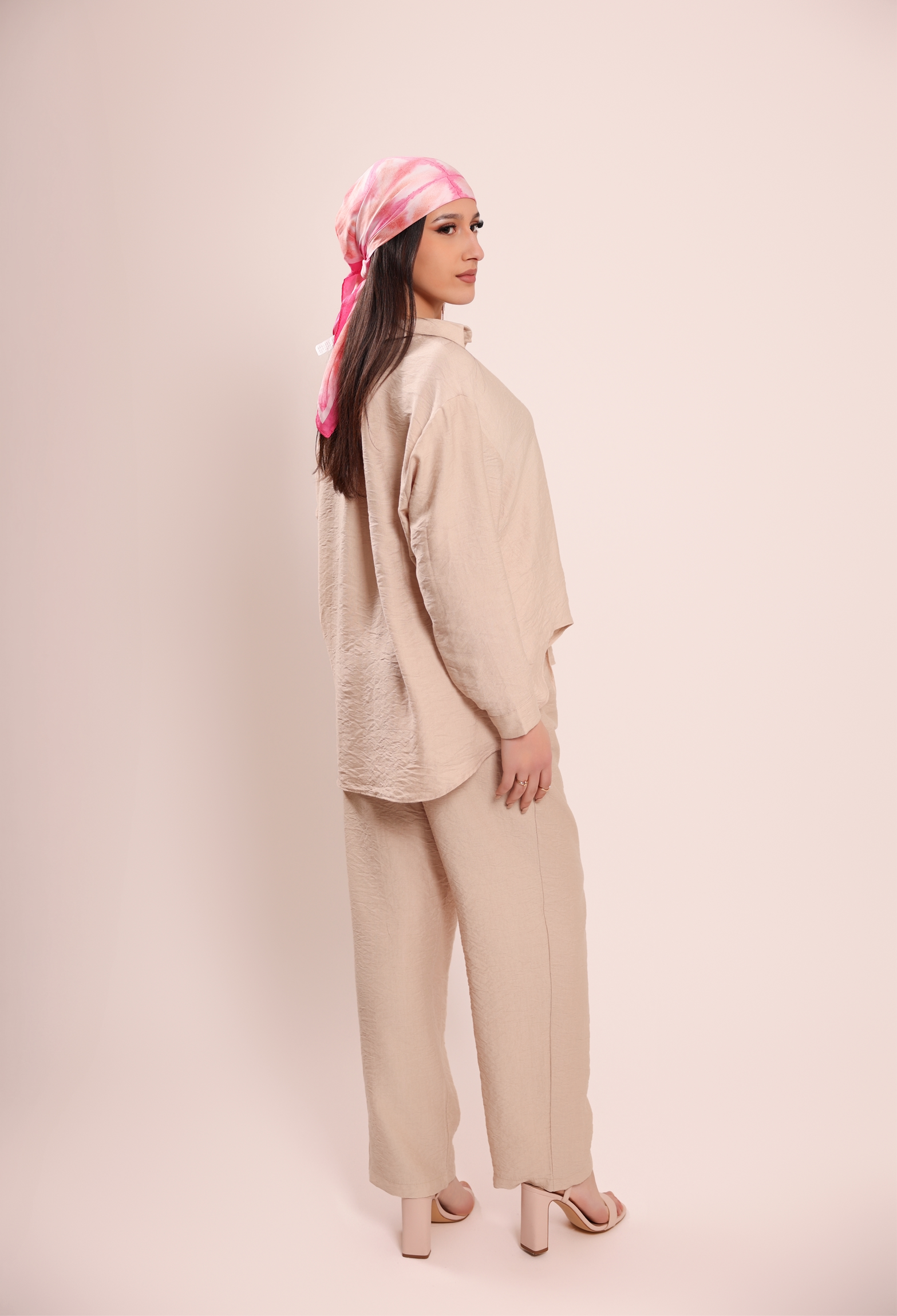 Zweiteiliges Set aus leichtem, atmungsaktivem Leinen. Gerade geschnittene Hose mit bequemer Passform und ein Langarmshirt mit lockerem Design. Ideal für jeden Anlass, vom lässigen Tag bis zum schicken Abend.