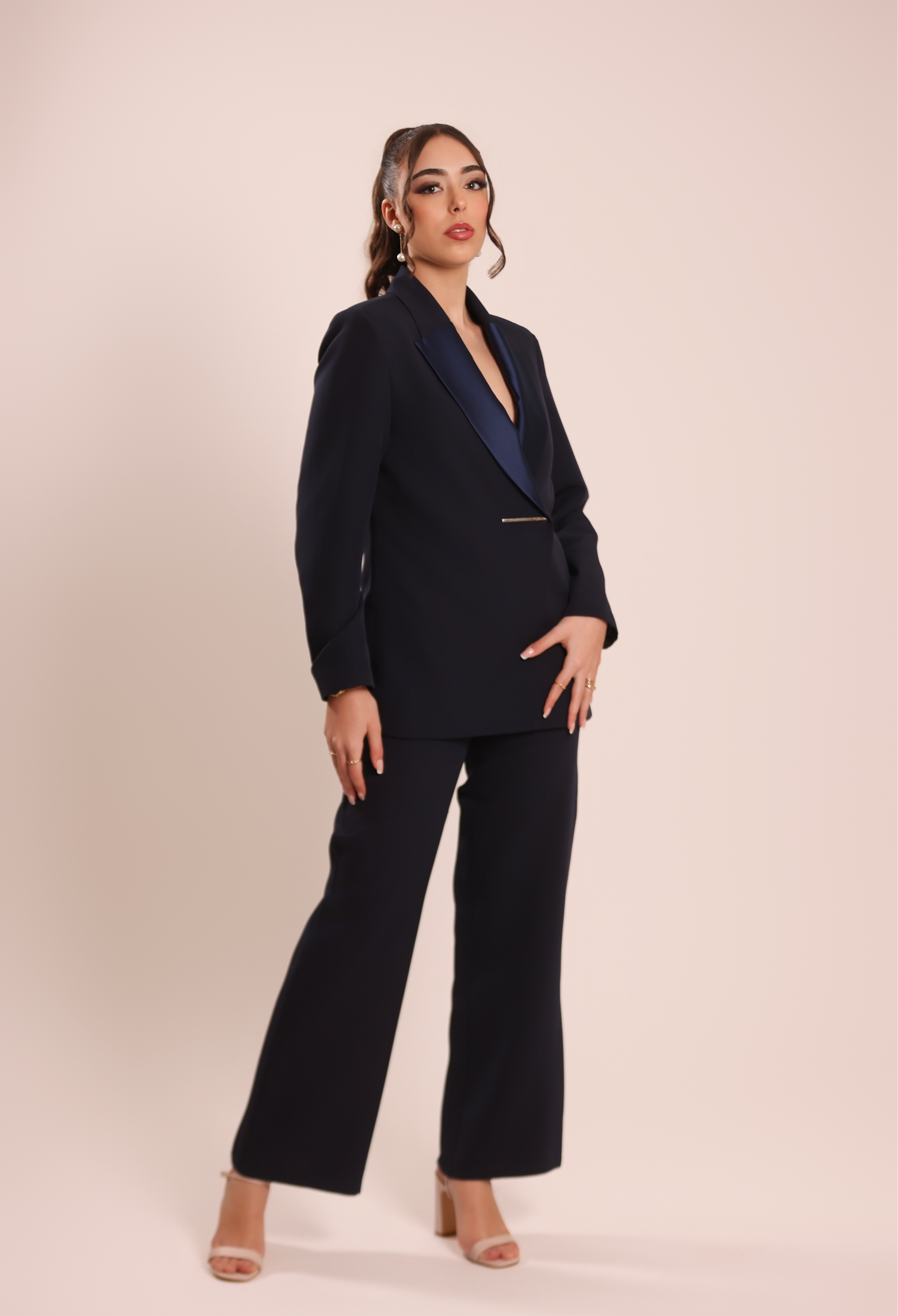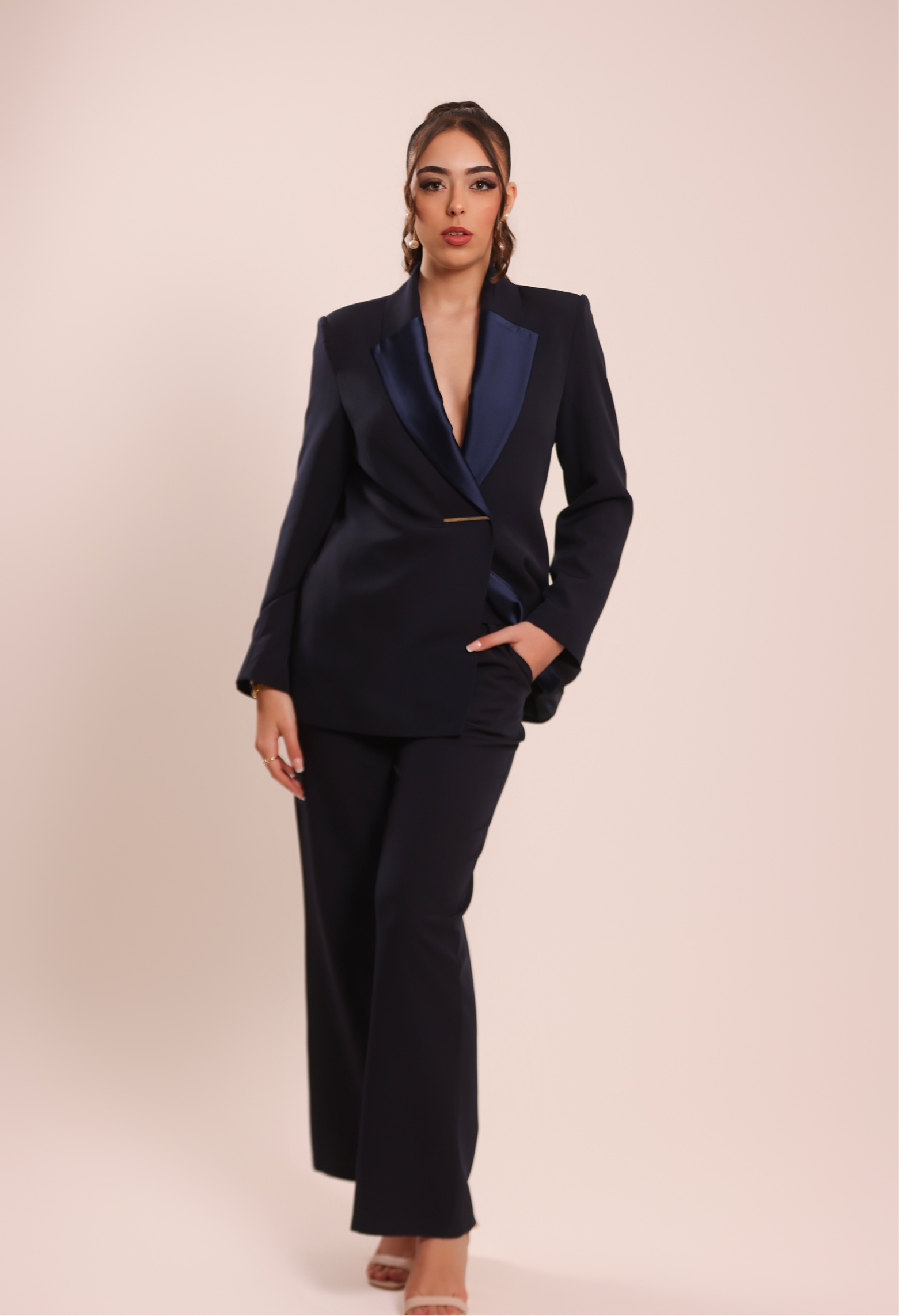 Marineblauer Anzug mit Satindetails. Metallverschluss und diskrete Taschen. Die Hose hat weite Beine, einen fließenden Fall und eine schmeichelhafte Passform. Es handelt sich um ein modernes Design, das sich ideal für formelle Veranstaltungen und Meetings eignet.