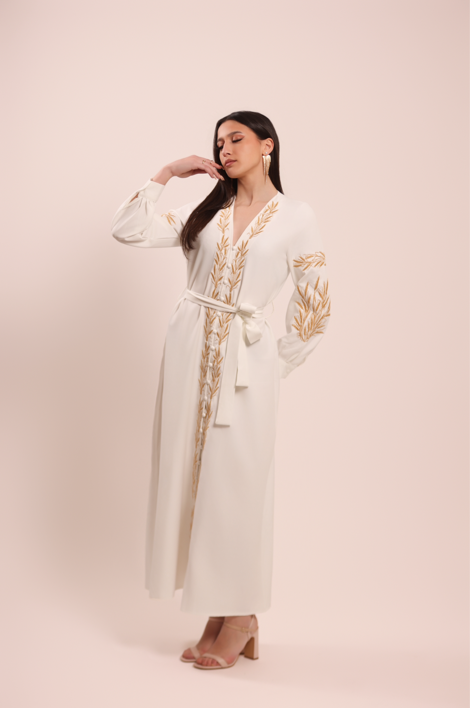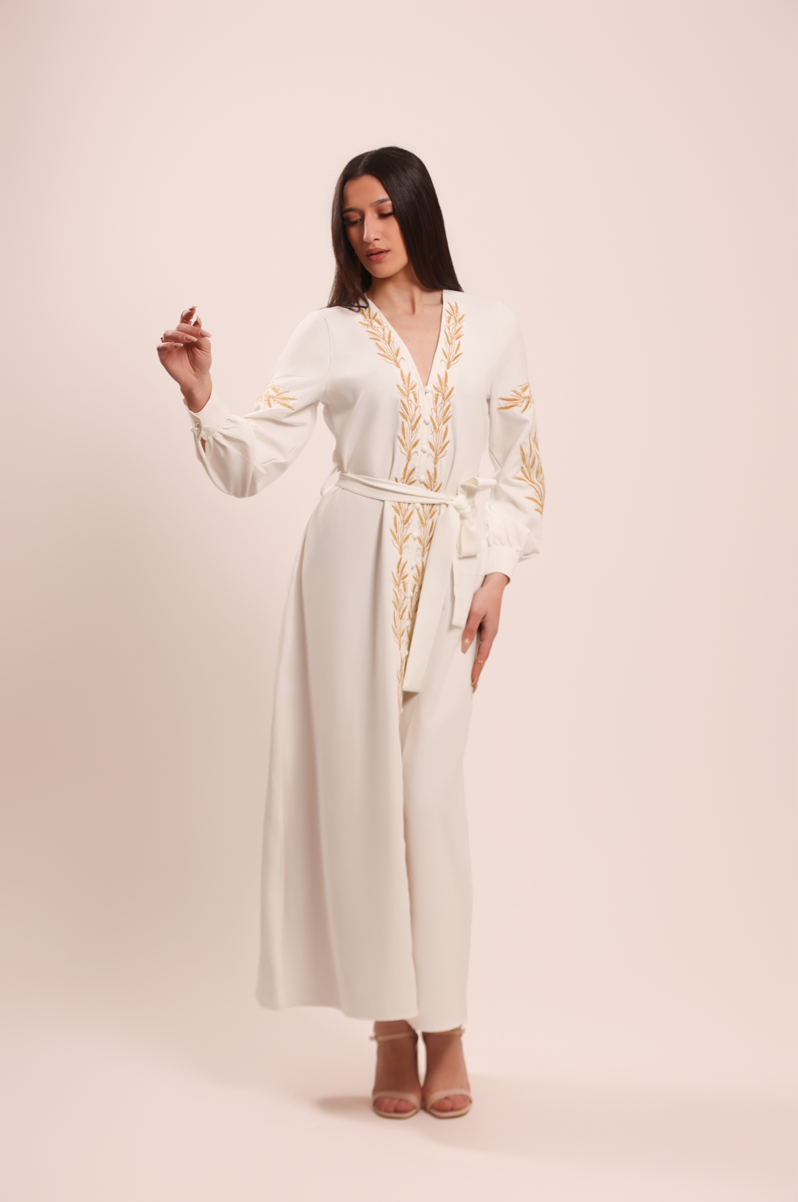 Langes weißes Kleid mit gestickten Details an den Ärmeln, die einen Hauch von Eleganz und Exklusivität verleihen. Es ist aus einem leichten, fließenden Stoff gefertigt und garantiert Komfort und Bewegungsfreiheit. Durch den strukturierten Schnitt und den verstellbaren Hüftgurt lässt es sich an unterschiedliche Stile und Vorlieben anpassen. Ideal für besondere Anlässe oder einen lässigen Look.