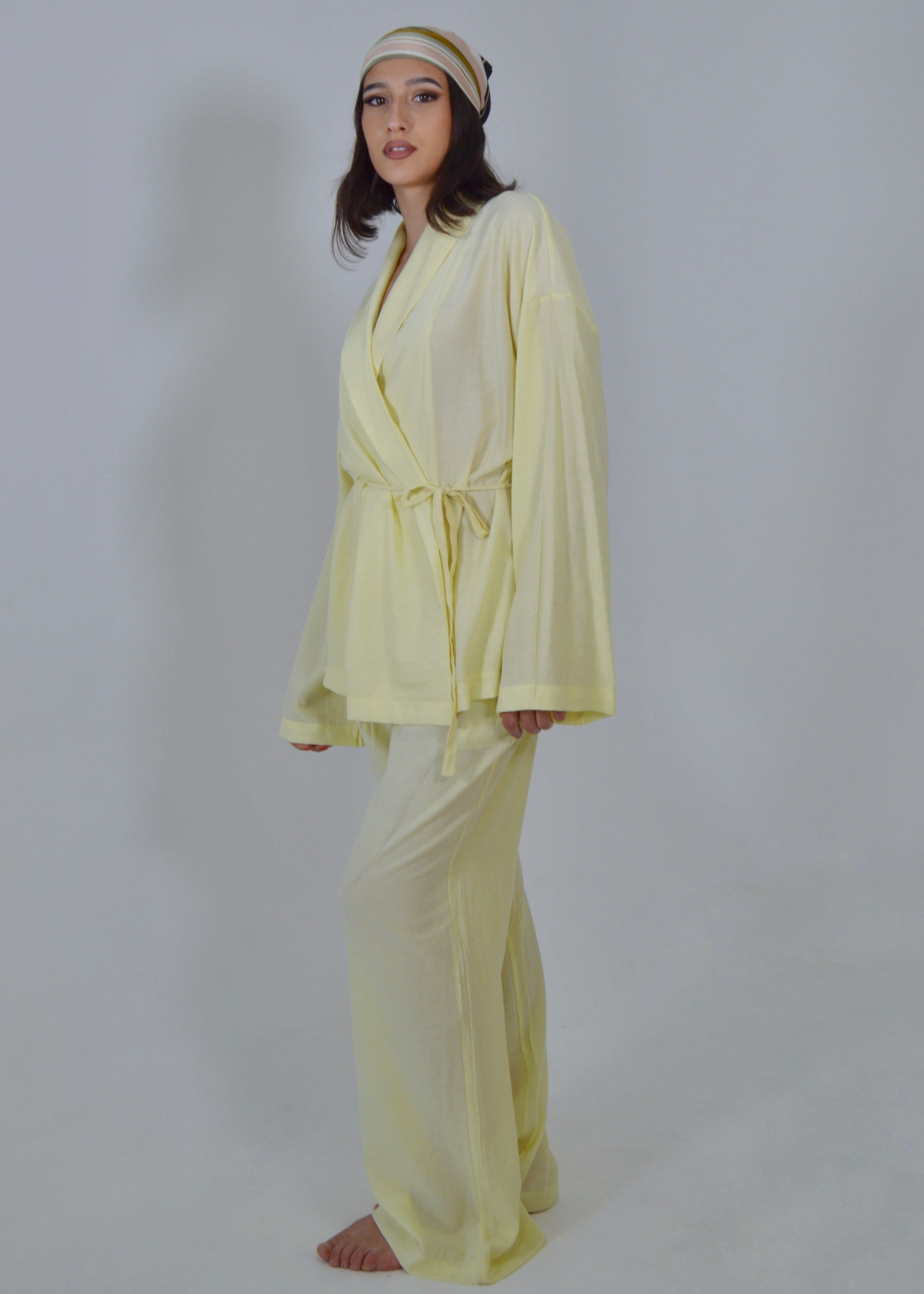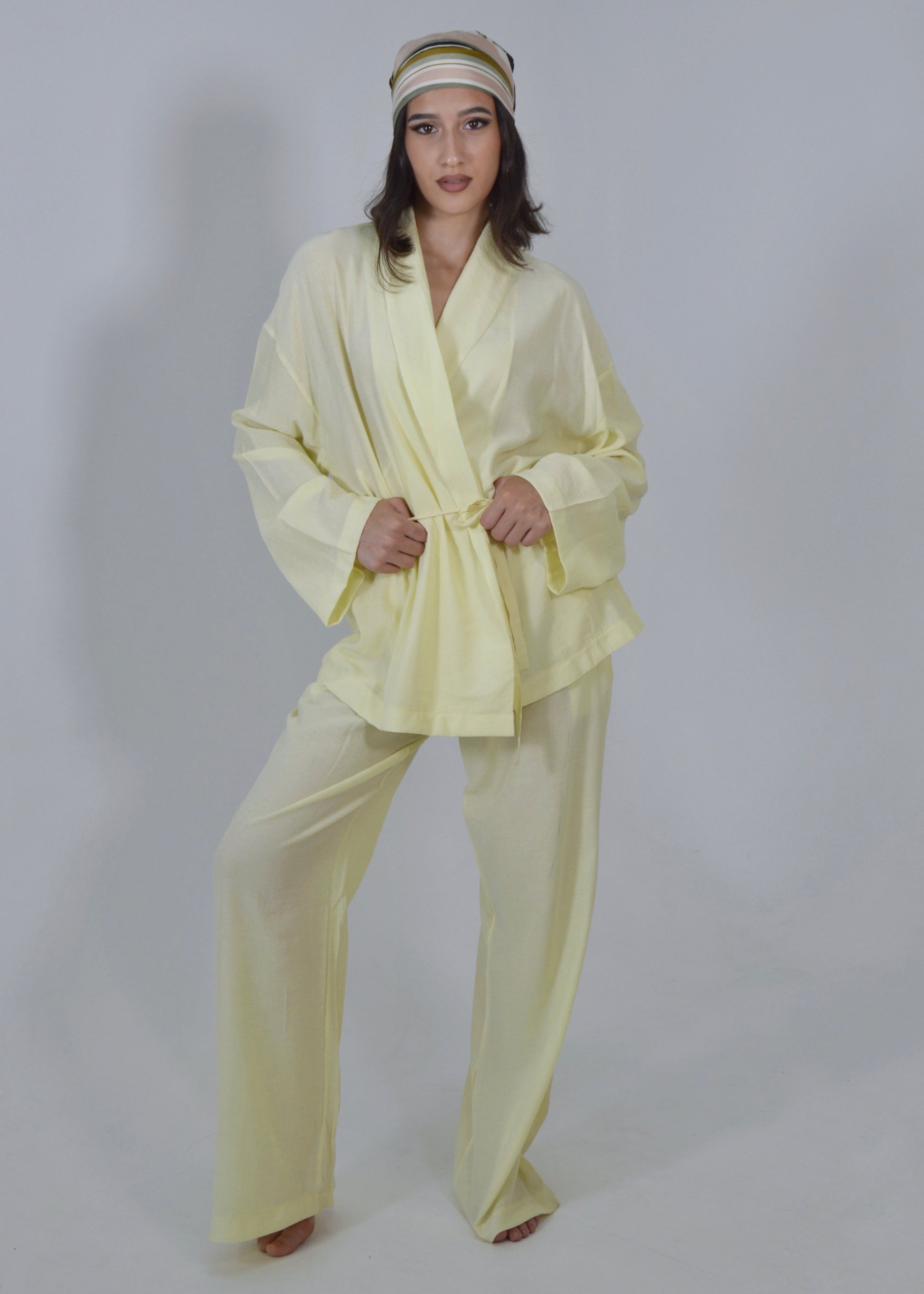 Refrescante y lleno de estilo, este conjunto de lino en tono amarillo aporta alegría y ligereza a tu look. El tejido natural garantiza frescura y comodidad, ideal para los días más cálidos.