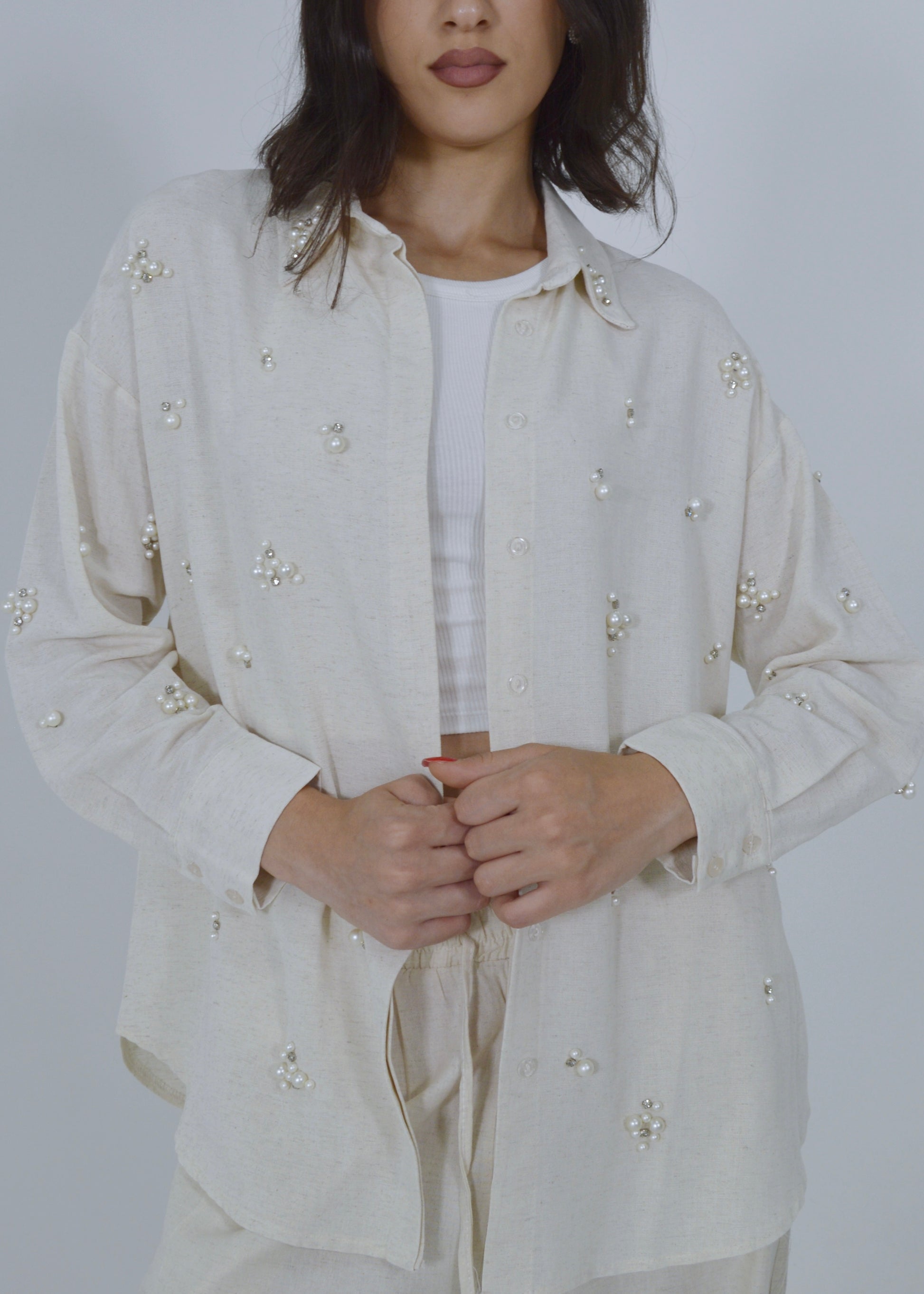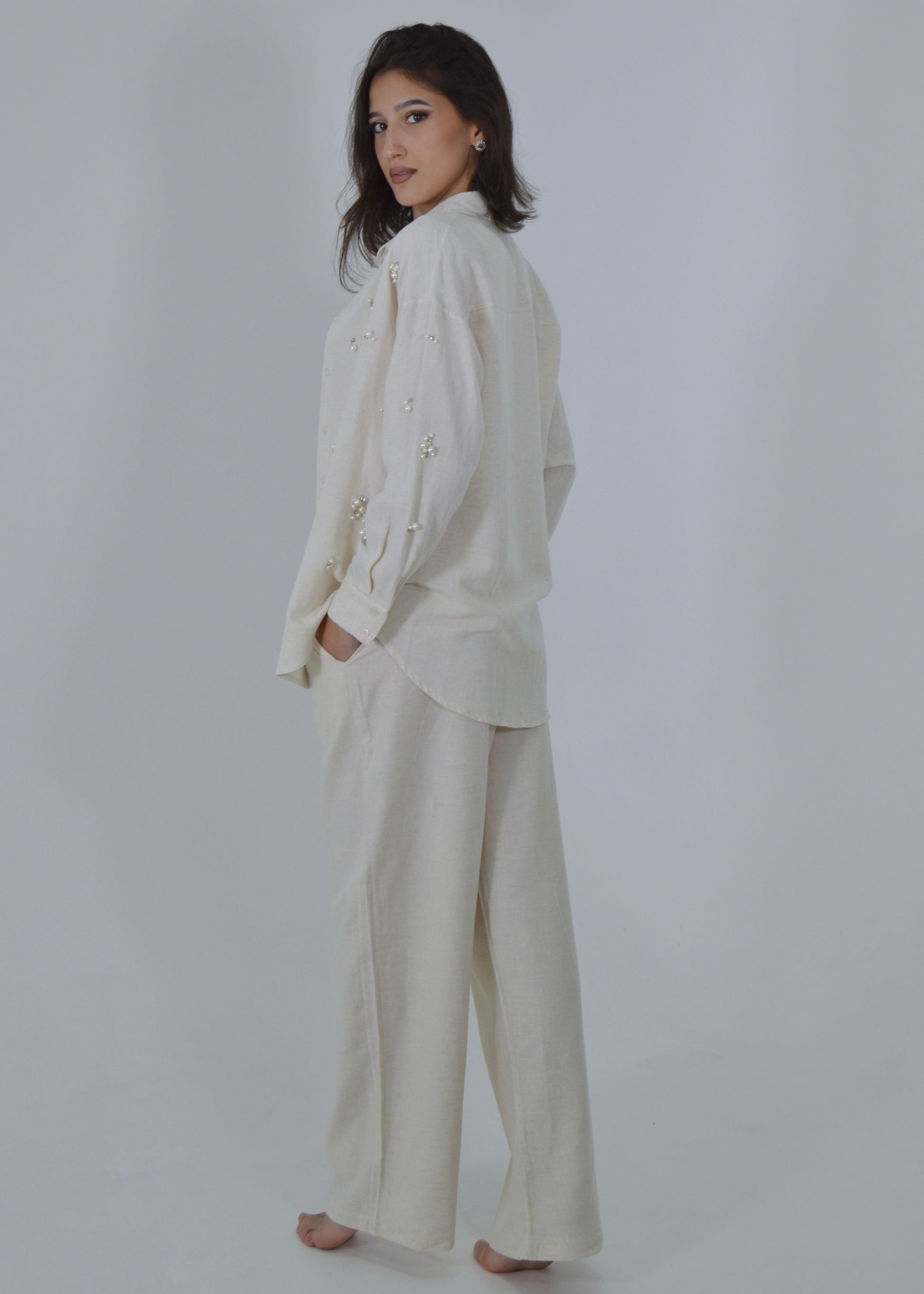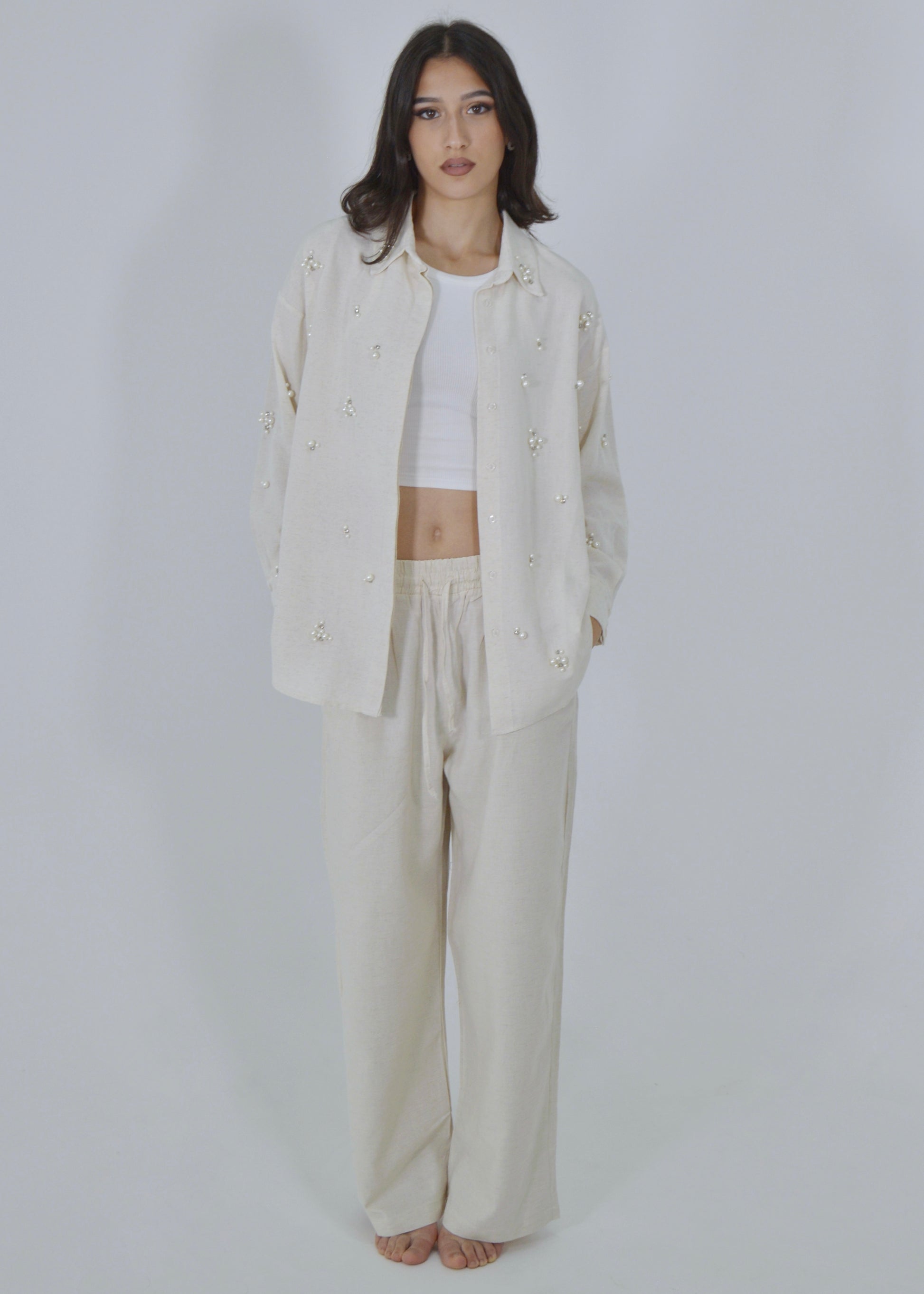 Luce un estilo refinado y femenino con nuestro conjunto de lino en tono beige, realzado con delicados detalles de perlas en la parte superior. Confeccionado en lino ligero y transpirable, este conjunto combina comodidad y elegancia.