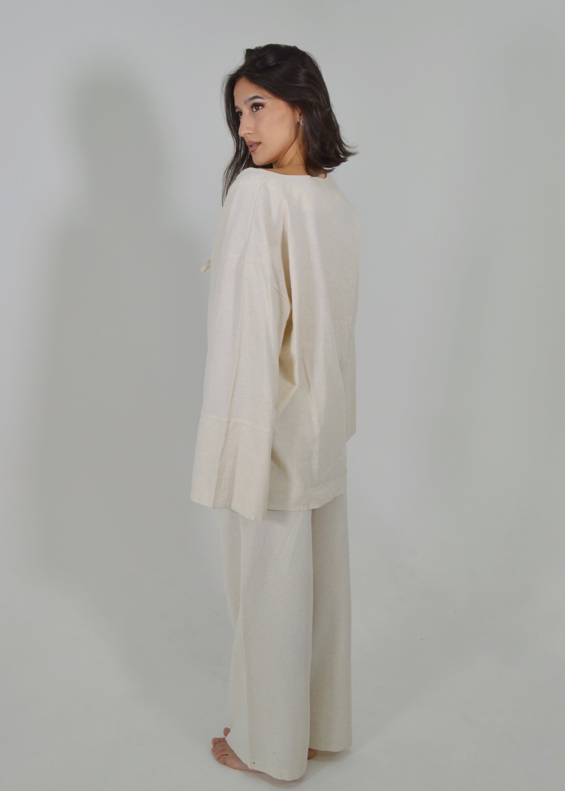 Descubre la combinación perfecta entre estilo y frescura con nuestro conjunto de lino en tono beige. Confeccionado con materiales de alta calidad, este conjunto ofrece una textura ligera y transpirable, ideal para mantenerte cómoda durante todo el día.