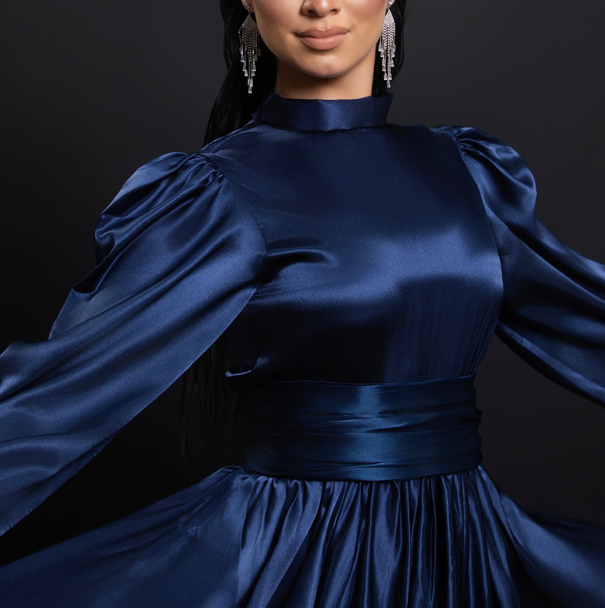 El vestido “Sapphire” está diseñado para mujeres que buscan brillar con sofisticación. Su satén de alta caída, el corte marcado en cintura y las mangas abullonadas crean una silueta poderosa, ideal para ocasiones especiales como galas, bodas, cenas de etiqueta o recepciones.