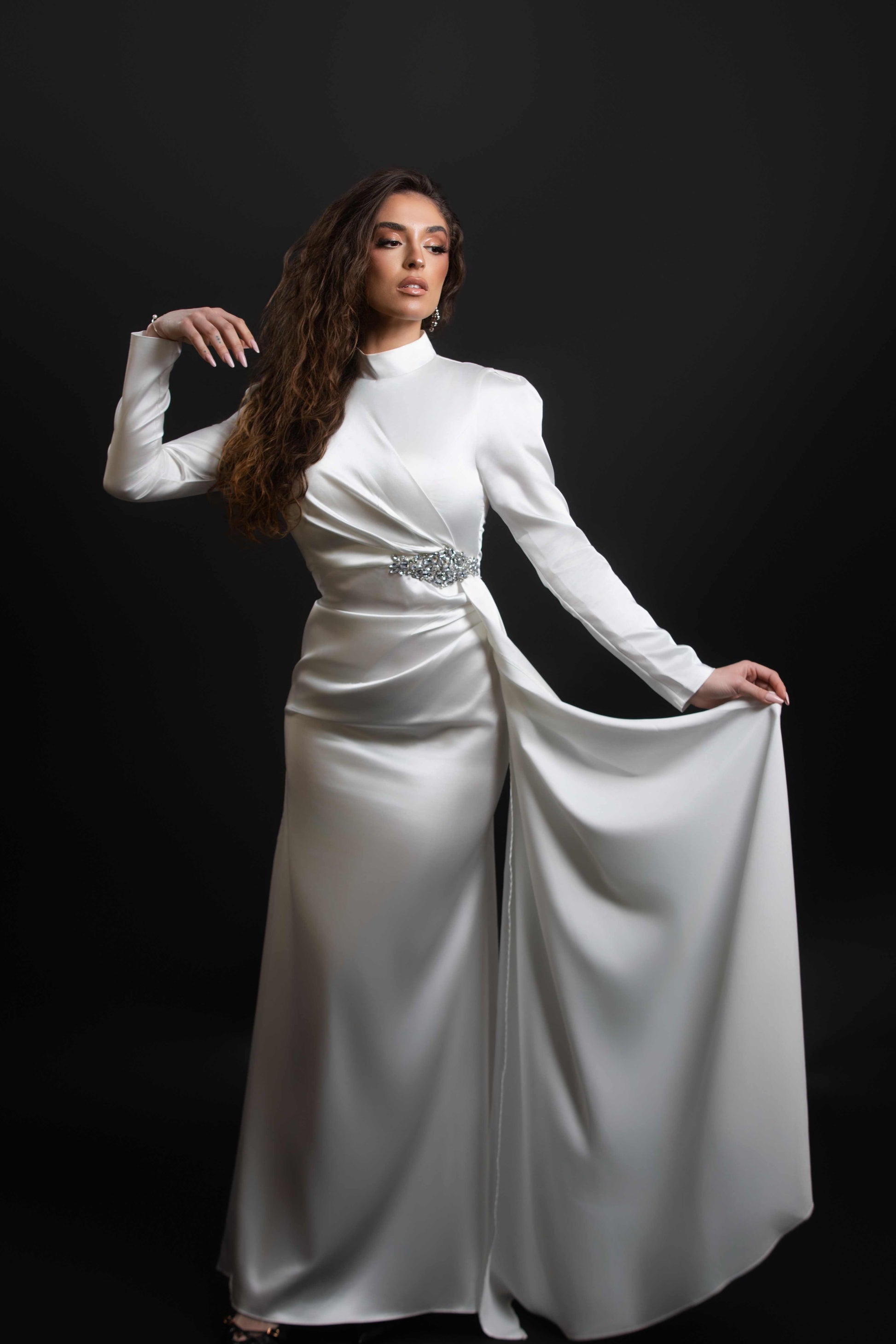 Descubre la sofisticación pura con el vestido "Atenea", pensado para novias que desean un look moderno y refinado en su ceremonia civil. Su diseño minimalista en satén blanco, el cuello alto, y el detalle de pedrería en la cintura lo convierten en una pieza de alto impacto visual con una elegancia contenida.